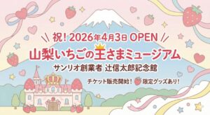 サンリオミュージアム(山梨県甲斐市)の最新情報 山梨県甲斐市にサンリオの新ミュージアム「山梨いちごの王さまミュージアム サンリオ創業者 辻信太郎記念館」が2026年4月3日(金)にオープン決定が発表されましたね。 また、 […]