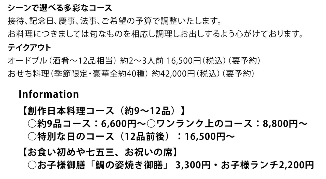 | 営業時間 | 火〜土・祝前日・祝日:18:00〜22:00(L.O.21:00) 日:18:00〜21:30(L.O.20:30) ※ 土日祝は昼営業(ランチ)も予約制で対応あり(要確認) |