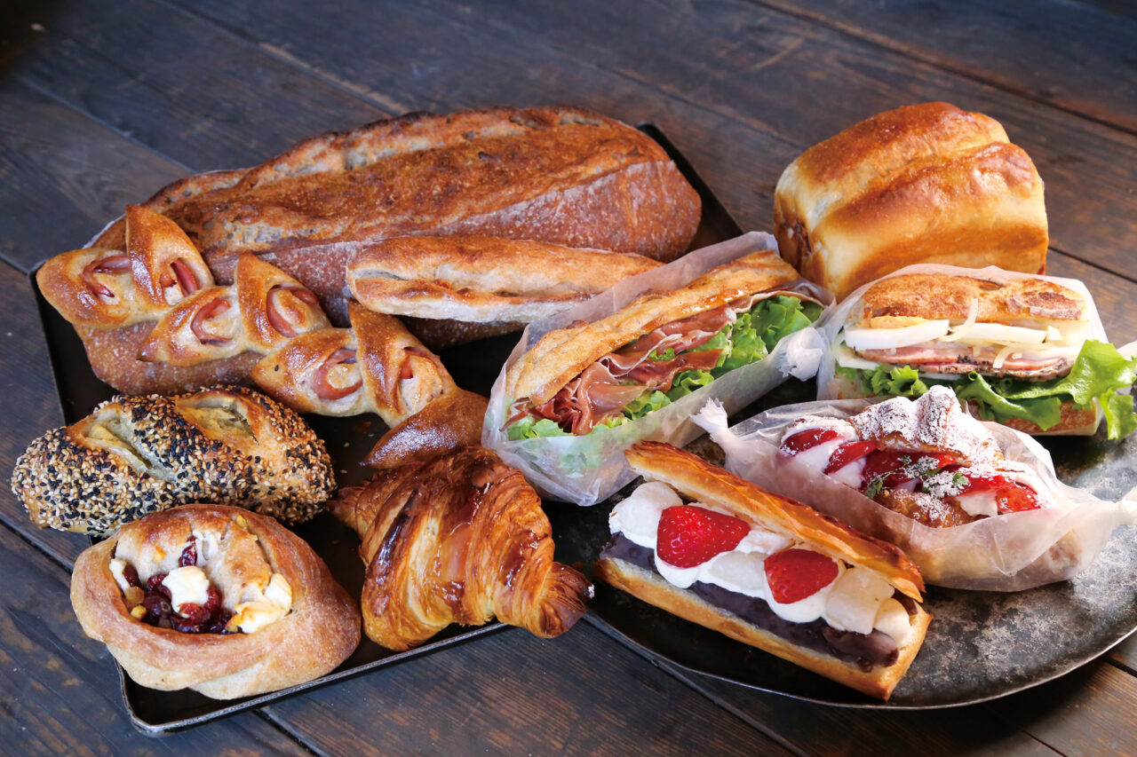 国産バターをたっぷり使ったオススメ商品のクロワッサン260円/オレンジピールとクランベリークリームチーズ360円/皮つきさつまいもペーストがたっぷり薩摩芋パン360円/ベーコンエピ(全粒粉の自家製酵母生地にベーコン)280円/山カンパーニュ1本1,080円(1/3本360円)/ホワイトチョコ マカダミア320円/生ハムサンド(スペイン産のハモンセラーノのサンドウィッチ)690 円/あんこ食パン420円(ハーフ210 円)/パストラミ&たまごオニオンサンド520円/苺のクロワッサンサンド(大沢農園さんの土で育った苺と自家製カスタードとフレッシュ生クリームをサンドしたクロワッサン)480円/いちご・ぎゅうひあんサンド430円※全て税込