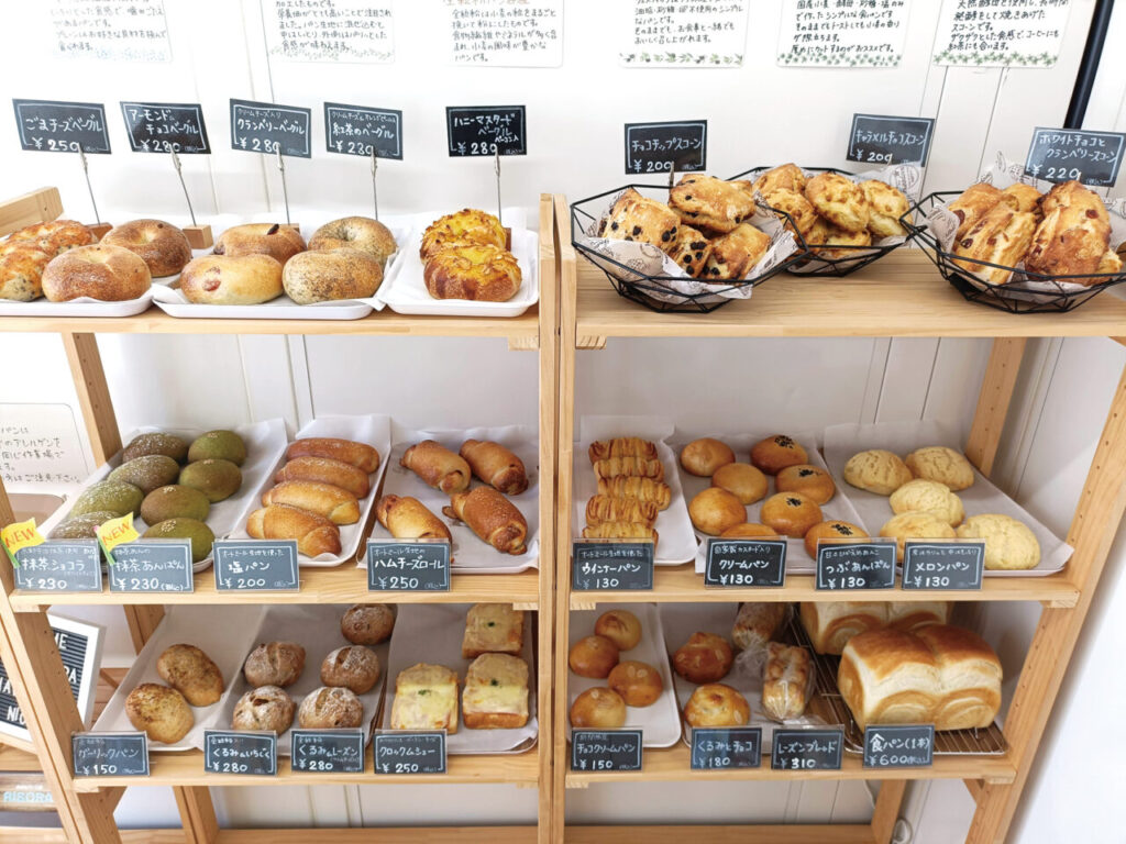 味わい深いパンやベーグルが約20種類ほど並ぶ♪「小さなパン工房 RISORA(リソラ)」は小さくてかわいい黒のプレハブが目印ですよ♪