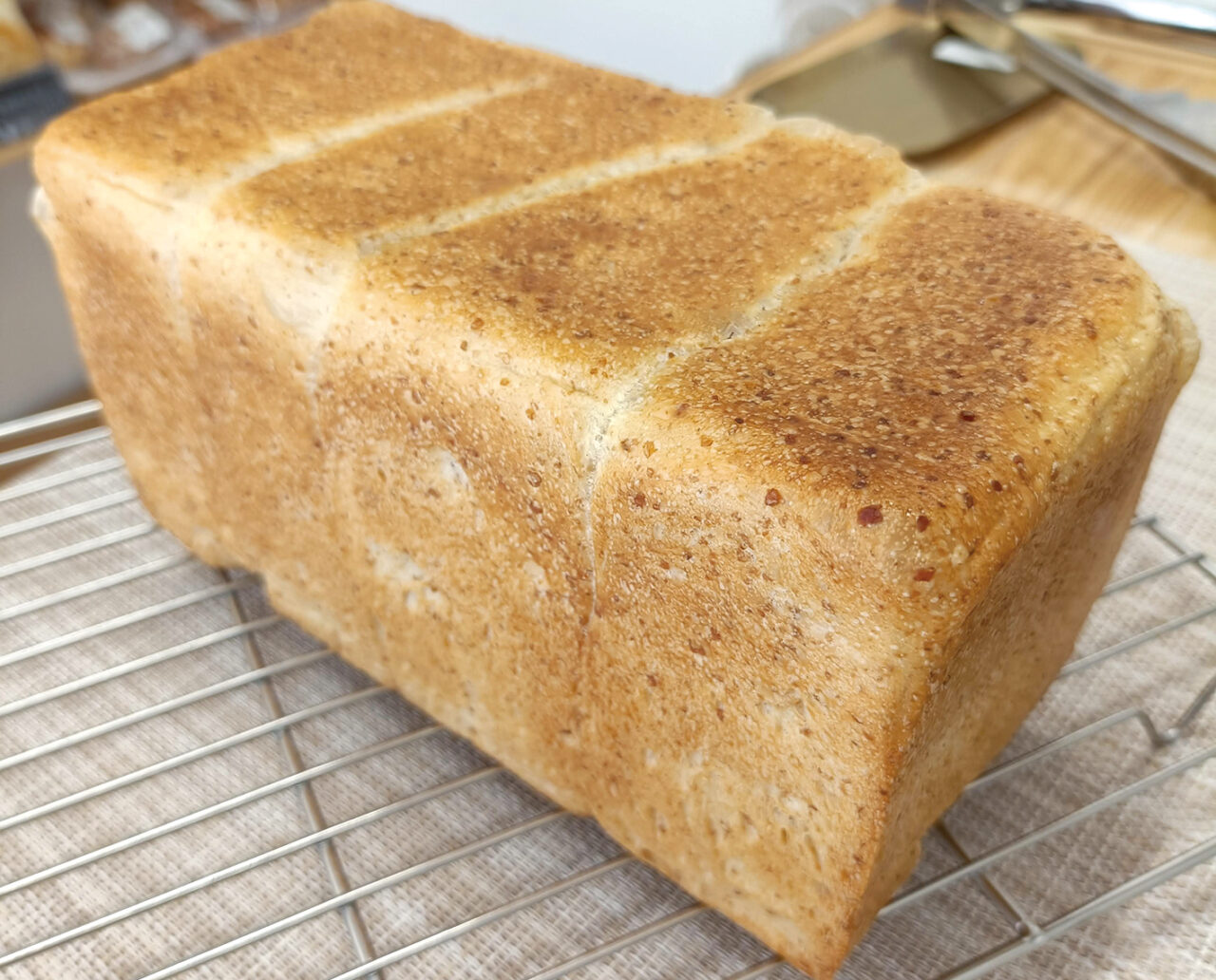 国産小麦の全粒粉を使った、香ばしい小麦の香りがふわっと広がる もっちり食パン(予約限定)。角食ならではのきめ細かいクラムで、トーストすれば外はカリッと中はもっちり。そのままでもおいしく、サンドイッチにすると具材をやさしく包み込んで相性抜群です。毎日の食卓がちょっと楽しみになる、こだわりの一斤をぜひ。