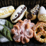 右手前のバスケットから時計回り、【豆パン】金時豆を菓子パンで包みました。190円【メープルフレンチ】ラウンドメープルをフレンチ液にたっぷり漬けました。230円【ピザトースト】たまねぎとベーコンのシンプルな一品。220円【チーズウィンナー】チーズ入りのウィンナーに生地を巻いてかりっと揚げました。280円【セサミフロマージュ】クリームチーズとゴマのフロランタンの相性抜群。300円【アマンドショコラ】ローストアーモンドとスイートチョコのサクサクデニッシュ。280円【サクサクショコラ】チョコレートを折り込んだクロワッサン、サクサクに焼きました。240円【ボストック】レーズンパンにシロップを塗りアーモンドクリームを絞りました。220円【メープルクロワッサン】メープルシロップをしみこませたクロワッサン270円【スイートクロワッサン】甘みのあるクロワッサンに蜂蜜のシロップをたっぷり!220円【クロワッサン】発酵バターを折込サクサクに仕上げました。230円【ロシェル】塩味のあるすっきりとした食パン。1斤330円【チーズブレット】全粒粉入りの生地にチーズをたっぷり包み焼きました。520円【小倉あんぱん】北海道産のあんこを包みました。190円【メロンパン】自家製メロンビスをのせて焼き上げました。200円【シュガーレーズン】ほんのり甘い生地にたっぷり入りのレーズンとシュガー。190円【くるみパン】くるみ入りの少し甘みのあるパン。230円【焼きカレー】自家製カレーを包み平焼きしました。220円【溶岩窯レーズン】レーズンとアーモンドクリームの入ったボリュームのあるパン。800円