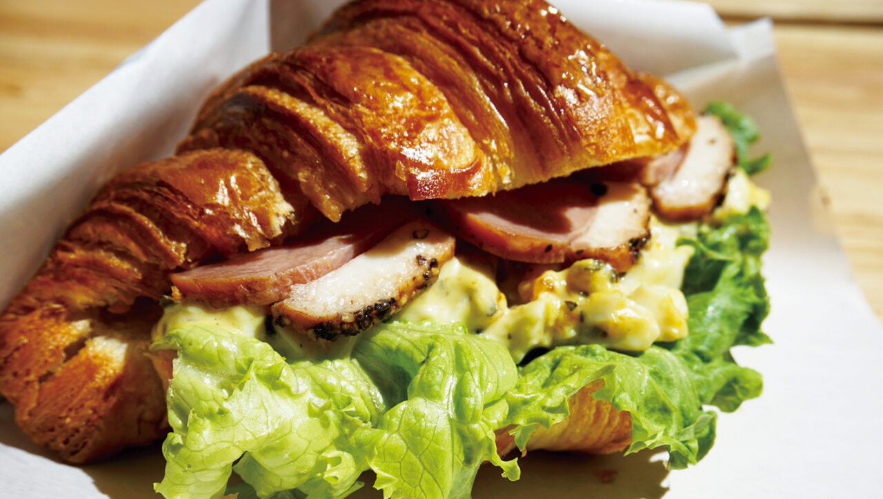 合鴨バジルクロワッサン/当店看板商品のクロワッサンをつかったサンドイッチ。サクサクでバターの香りのたつクロワッサンに、たっぷりのフィリングと合鴨肉をあわせたサンドイッチ。