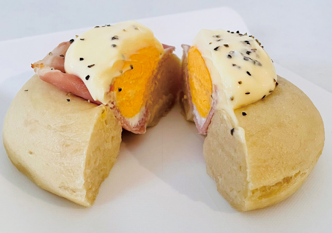 第1第3日曜日にのみ販売する月見米gel410円(税抜き)/プレーンの米gelにハムエッグがON。一度食べたらまた食べたくなる米gelです。