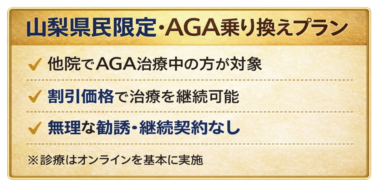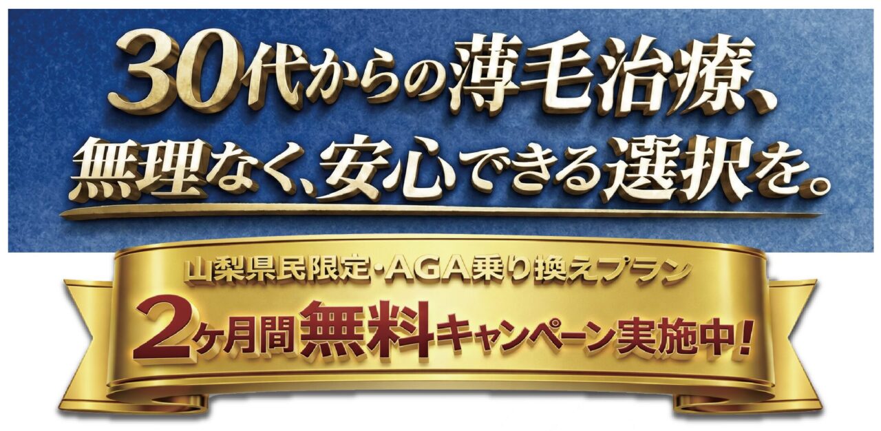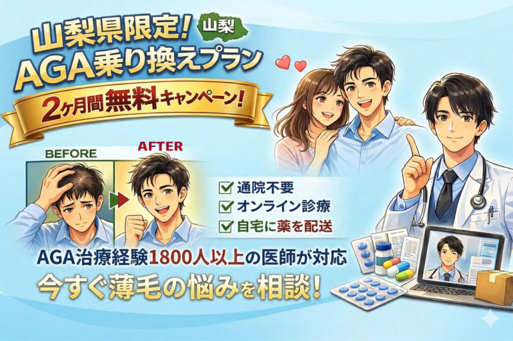 AGA治療2026.03.20【山梨県民限定】山梨県の医師が安心の対応!AGA乗り換えプランで2ヶ月無料!「このままでいいのか」 「費用や通院が負担」通院不要のオンライン薄毛治療とは?