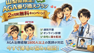 【山梨県民限定】山梨県の医師が安心の対応!AGA乗り換えプランで2ヶ月無料!「このままでいいのか」 「費用や通院が負担」通院不要のオンライン薄毛治療とは?