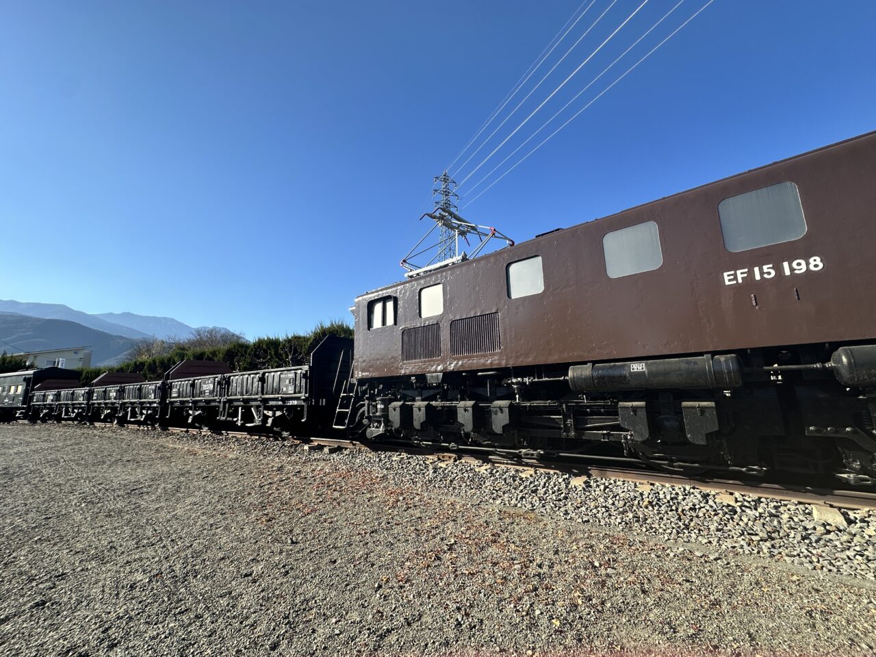 公園内には、巨大カブトムシや蒸気機関車、電気機関車などのオブジェもあり、子どもたちが興味津々!!保存鉄道もあり、貨物列車には実際に乗れちゃう嬉しさ♪