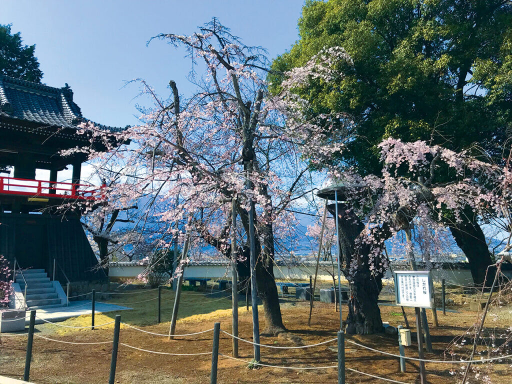 やわらかく垂れ下がる桜の枝が境内を包み込み、春の訪れを一足早く感じられる名所です。