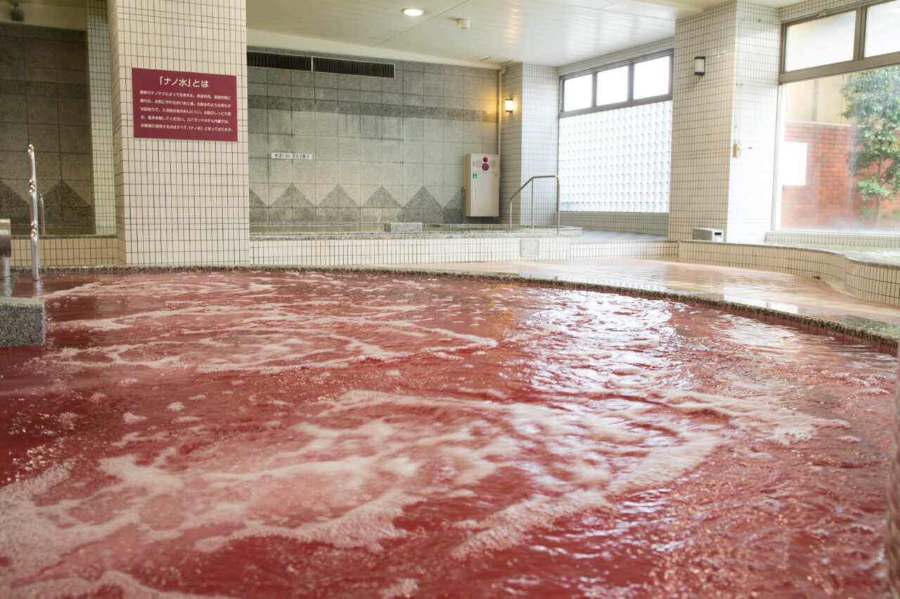 甲州ワイン風呂: 山梨ならでは!鮮やかな紫色のお湯から漂う芳醇な香りが、日常を忘れさせてくれます。