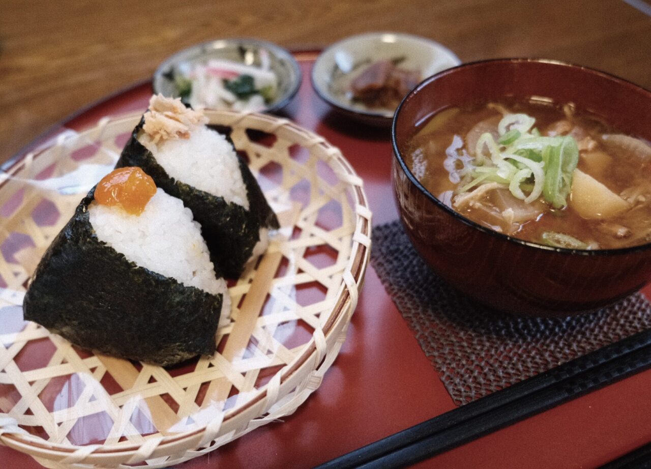 愛情たっぷり!握りたてのおむすび。山梨県北杜市産、梨北のお米を使用。山梨のこだわり味噌と地元の野菜を使用した具だくさん豚汁。ばーちゃん考案の特製漬物の一汁一菜定食です。おむすび2個セット 880円(税込)、おむすび1個セット 660円(税込)、単品[おむすび] 250円(税込)~。