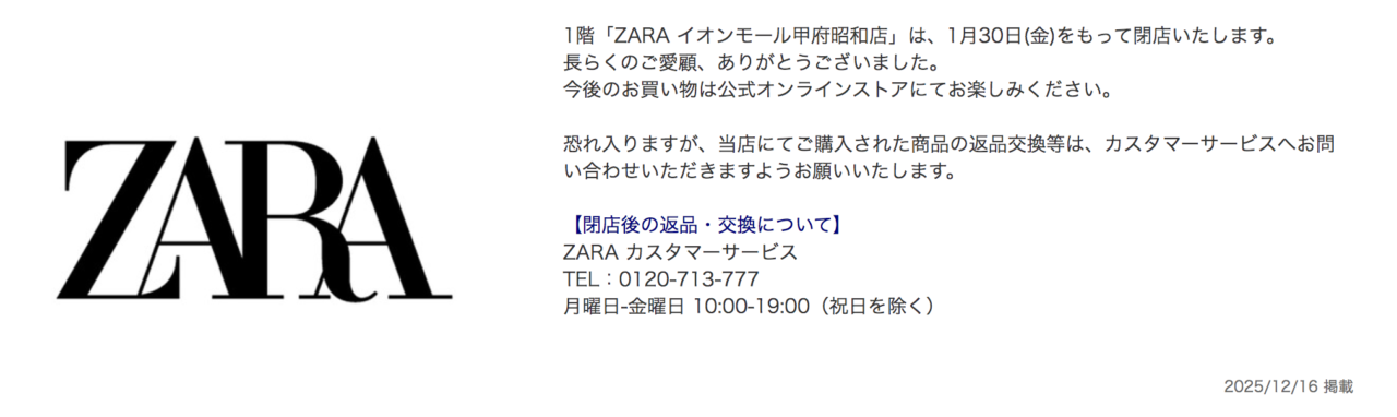 閉店2025.12.17【ZARA 2026.1.30閉店】残念!ビックリ!泣いちゃう!!「ZARAイオンモール甲府昭和店」閉店!!もう山梨県で買えなくなっちゃう〜(T . T)