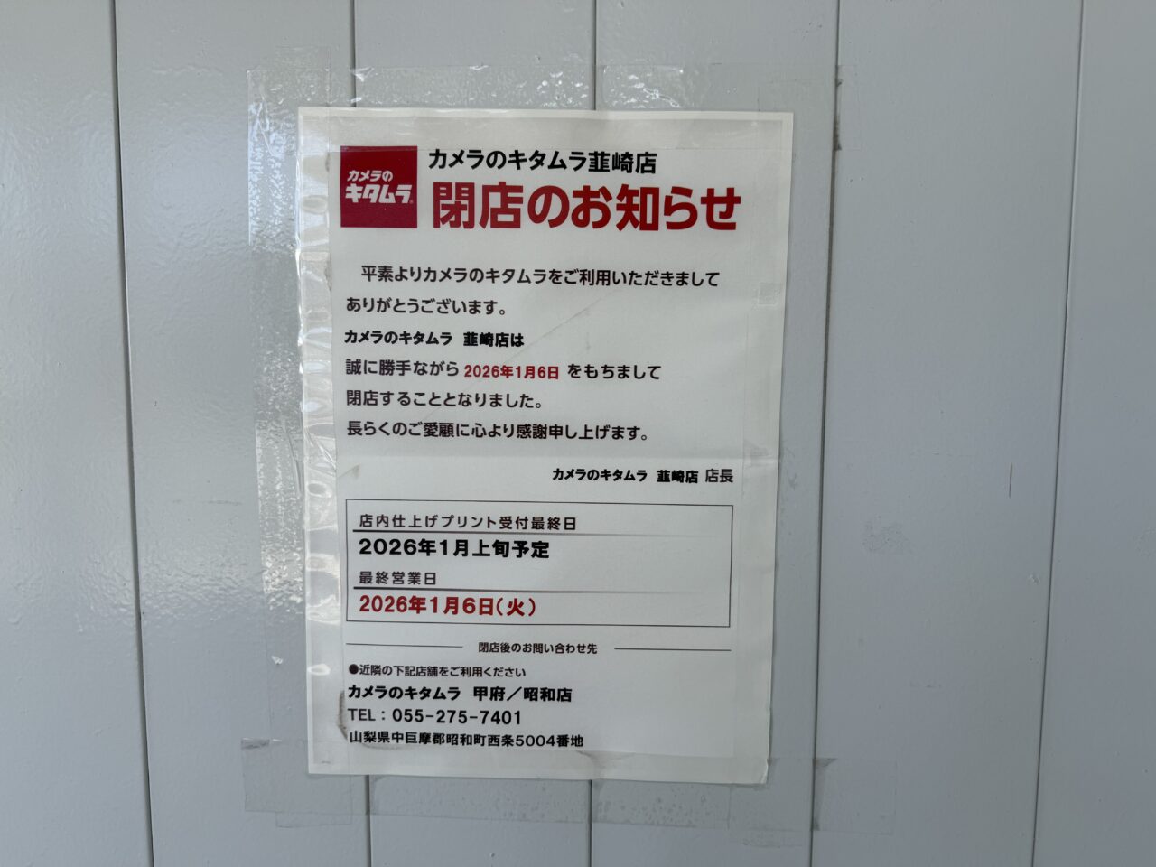 【閉店情報】「カメラのキタムラ 韮崎店」 2026年1月6日に閉店してた。