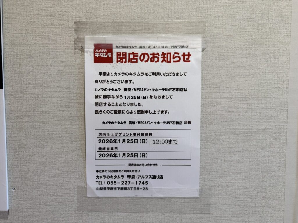 【閉店情報】「カメラのキタムラ笛吹・MEGAドン・キホーテUNY石和店」 も2026年1月25日(日)に閉店してた