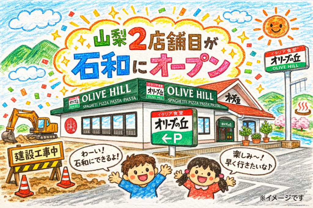 山梨県内で人気を集めるイタリアンファミリーレストラン「オリーブの丘」が、ついに2店舗目を石和町に出店予定!現在、笛吹市石和町エリアで建設工事が進められており、オープン前から注目を集めています。