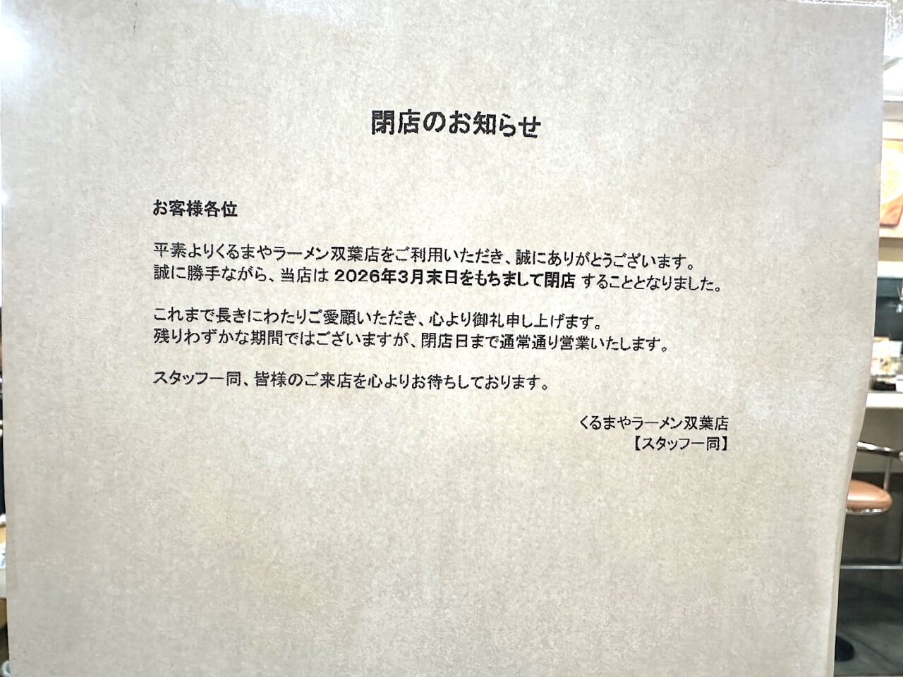山梨・甲斐市で長年親しまれてきた「くるまやラーメン双葉店」が、2026年3月末日をもって閉店することが店頭のお知らせで案内されていました。
