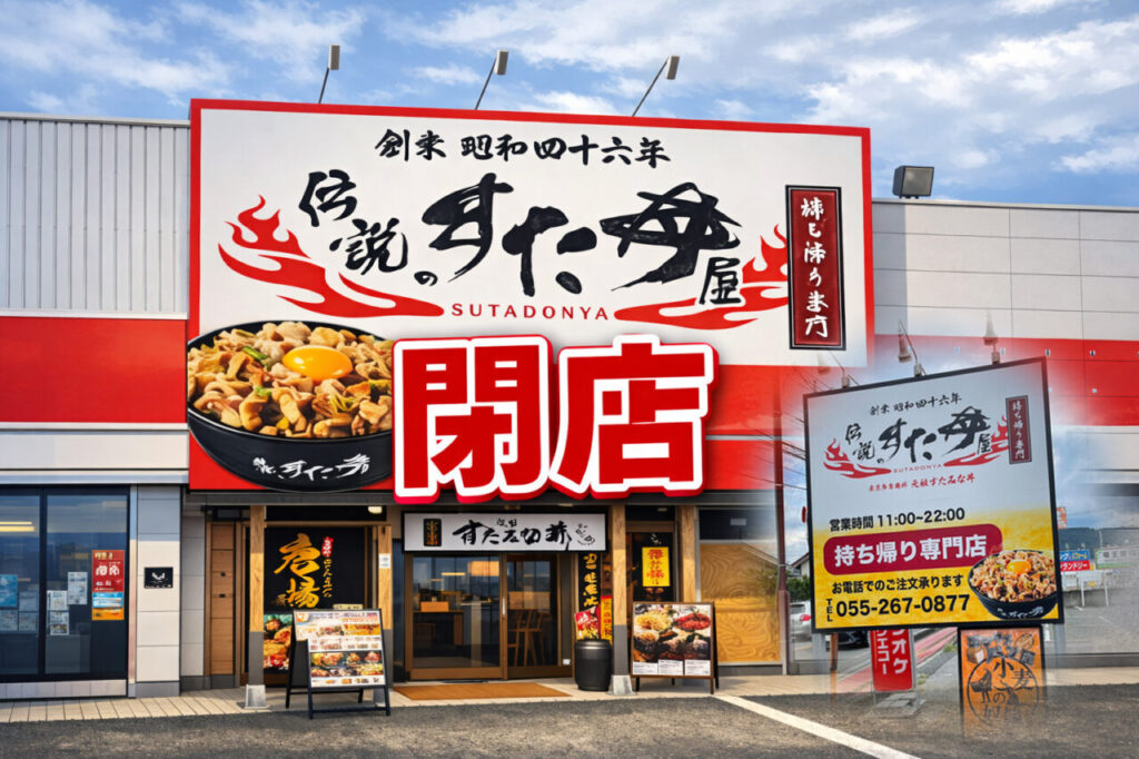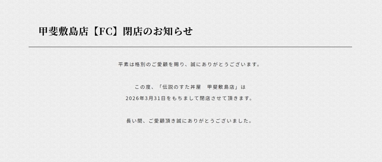 甲斐市の「伝説のすた丼屋 甲斐敷島店」が閉店したことがわかりました。