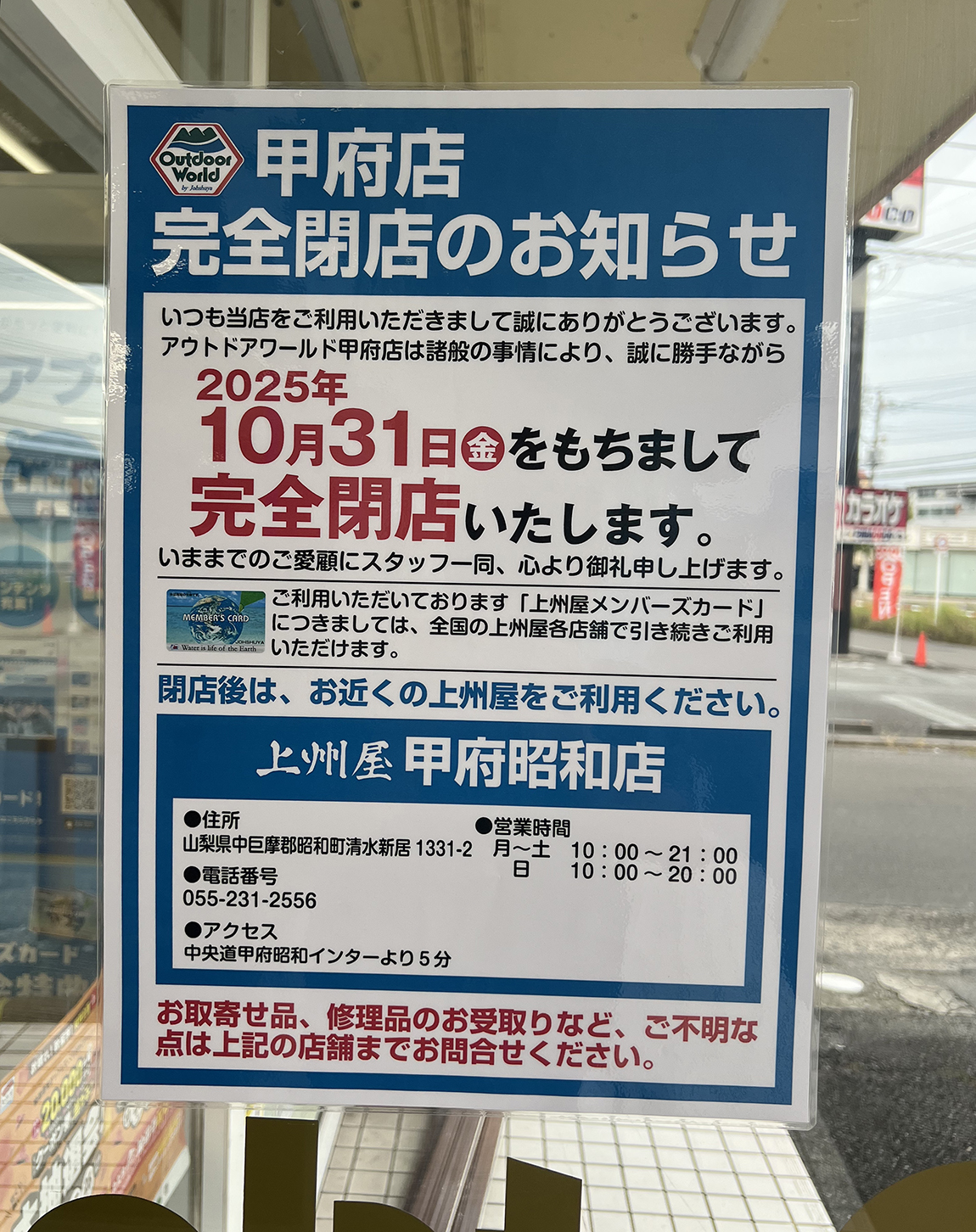【感謝】長年お世話になった「アウトドアワールド 甲府店」が10月31日(金)閉店するそうです!!!