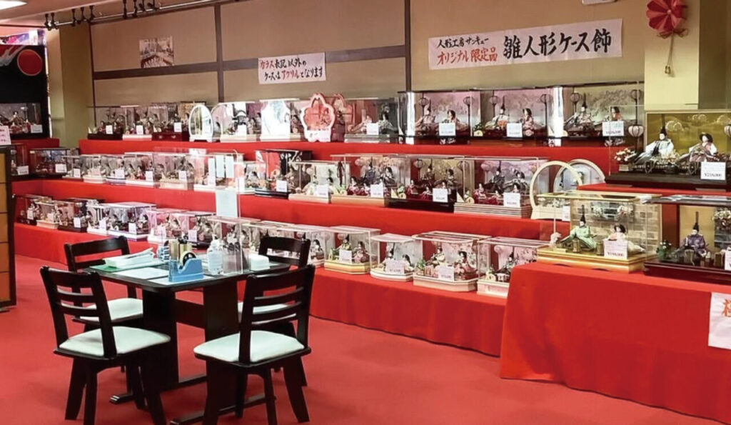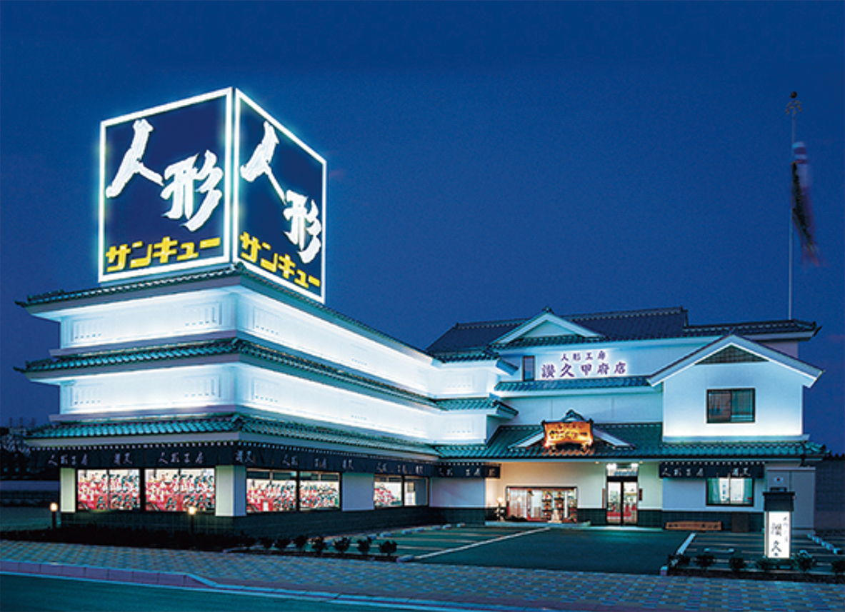 1969年創業、日本最大級の規模を誇り、自社工房でオリジナル商品も制作。雛人形・五月人形・鯉のぼり・盆提灯・市松人形などを幅広く扱い、「売るだけではなく、家族の絆や日本の伝統を伝える」ことを大切に、地域に根ざした活動と、思い出の着物を人形用に仕立てるサービスも行っている。