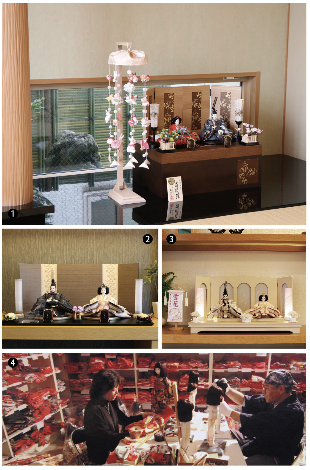 ①収納親王飾り②③「親王飾り」は、天皇・皇后(内裏様)の姿を模した男雛(お内裏様)と女雛(お雛様)の二体のみを飾る、最も基本的な雛人形の飾り方で、女の子の幸せな結婚と健やかな成長を願う意味が込められています。コンパクトで豪華な衣装のものが多く、現代の住宅事情にも合うと人気で、飾る場所に合わせて飾れるのが特徴です。 ④工房の様子。全商品職人の手作りで、全く同じものは存在しません。伝統を大切に、一体ずつ丁寧につくられたお人形の温かみを感じて下さい。
