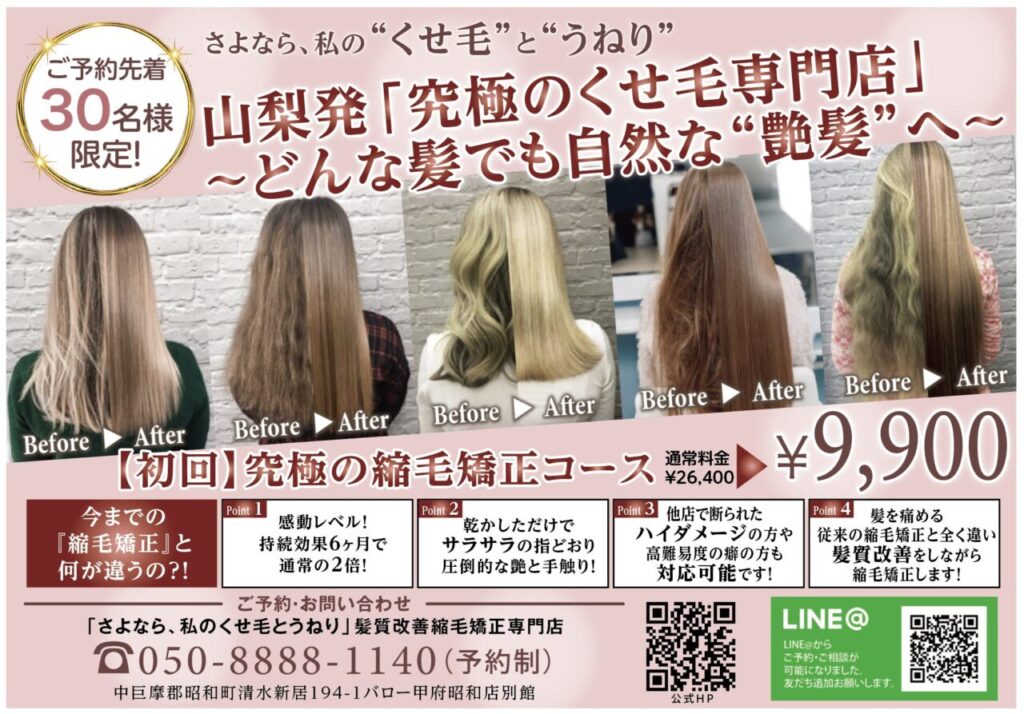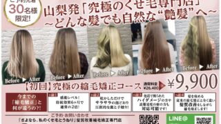 【山梨県初】「さよなら、私のくせ毛とうねり」 は、 くせ毛・うねり・髪質改善を専門にした美容室(縮毛矯正専門サロン)です!